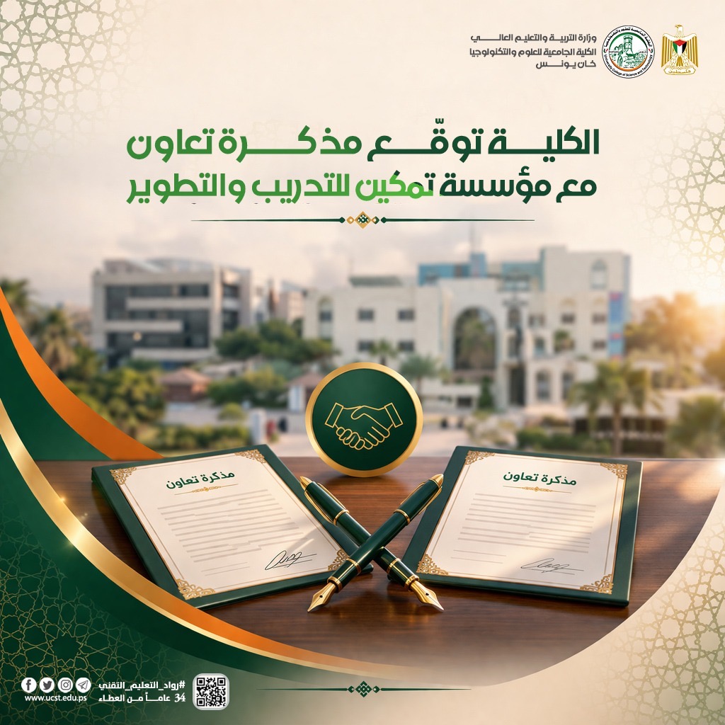 وقد وقّع مذكرة التعاون عن الكلية الجامعية للعلوم والتكنولوجيا عميدها الدكتور سعد الدين البلتاجي، فيما وقّعها عن مؤسسة تمكين للتدريب والتطوير رئيس المؤسسة الدكتور أحمد الوادية، وذلك في إطار توجه مشترك نحو تعزيز التعاون بين المؤسسات الأكاديمية ومؤسسات التدريب والتطوير، بما يفتح آفاقًا جديدة أمام الطلبة والشباب للاستفادة من البرامج التدريبية النوعية، وصقل مهاراتهم العلمية والعملية، وتهيئتهم بصورة أفضل لمتطلبات سوق العمل.